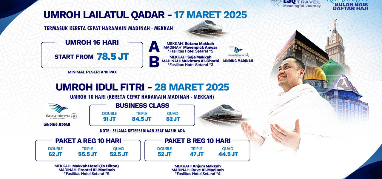 Umrah Lailatul Qadar 1446 H bersama ESQ Tours menghadirkan pengalaman ibadah yang penuh makna di Tanah Suci pada 10 malam terakhir Ramadhan. Program ini dirancang khusus untuk membantu jamaah meraih malam Lailatul Qadar yang lebih baik dari seribu bulan, dengan bimbingan ibadah dan pendampingan ruhani oleh trainer serta pembimbing berpengalaman.